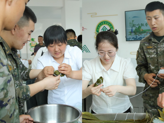 食堂里弥漫着粽叶的清香,军民共话端午。兵妈妈们手把手教年轻战士折叶、填米、捆绳,“要像握钢枪一样稳,但力度要柔”的叮嘱里满含长辈的关爱。军嫂们分享着包粽子的心得,欢声笑语中,一个个棱角分明的粽子逐渐堆满食盆。战士们看着自己亲手包的粽子兴奋地说:“第一次包粽子就成功,这份‘战果’要拍照发给爸妈看!”