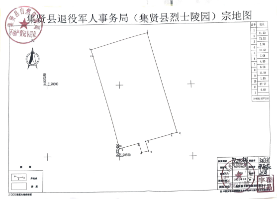 一、集贤县烈士陵园:集贤县烈士陵园位于笔架山水库北侧,保护范围划定为:纪念碑及附属设施总占地面积为3035.56平方米,保护范围分别朝东南西北固定为界,东南侧向外延伸5米。