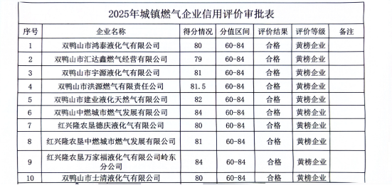 为加强我市城镇燃气管理,规范市场秩序,确保燃气安全稳定运行,促进燃气行业健康、平稳、可持续发展,根据黑龙江省住房和城乡建设厅关于印发《黑龙江省城镇燃气经营企业信用评价管理暂行办法》的通知(黑建规范〔2021〕9号),对我市2025年城镇燃气经营企业进行信用评价,现将评价结果公示如下: