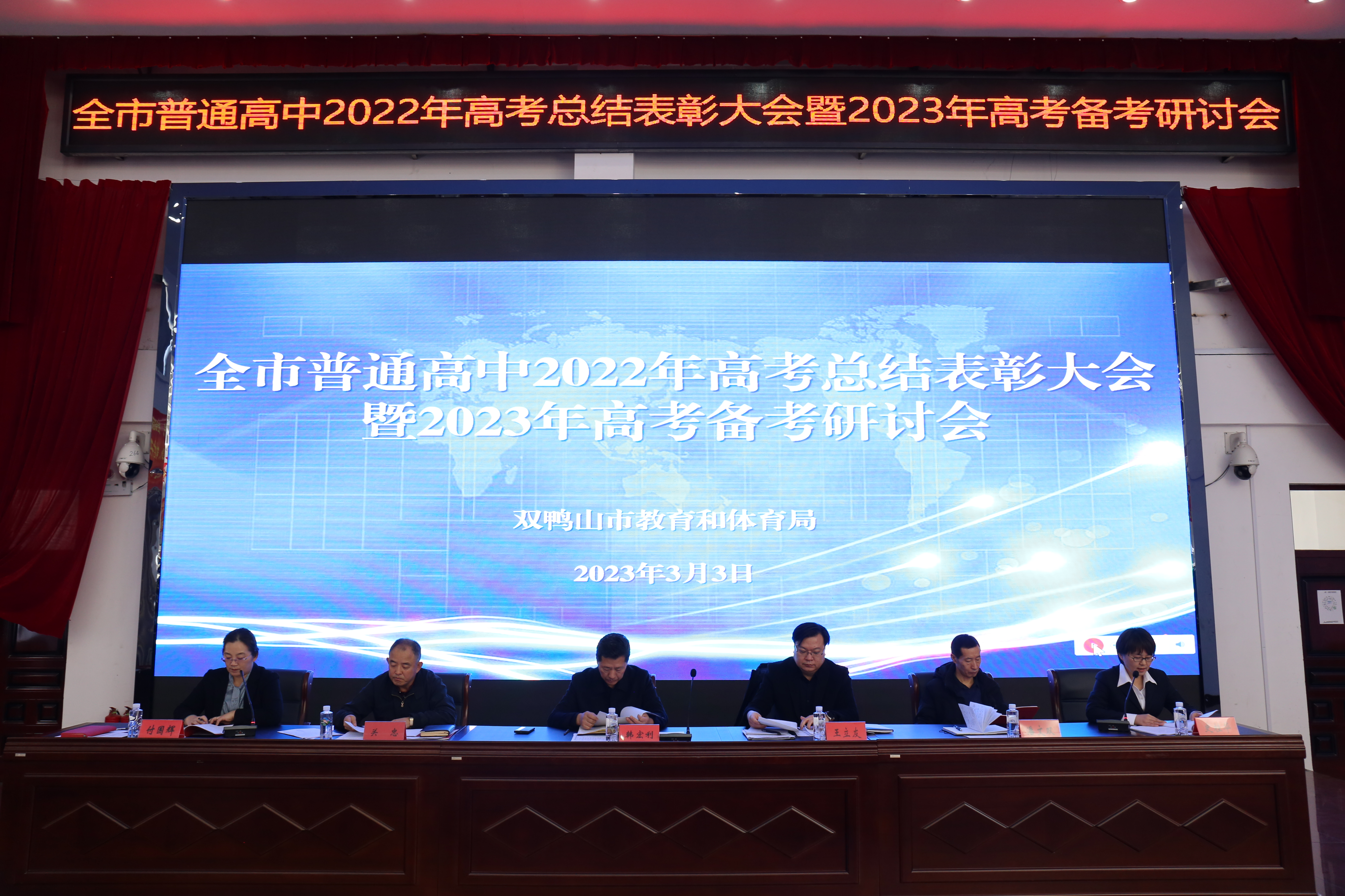 3月3日,为提升我市高考备考整体能力,共享前沿高考资讯,迎接新考改挑战,市教育和体育局组织召开了全市普通高中2022年高考总结表彰大会暨2023年高考备考研讨会。市教育和体育局相关领导、市教师发展学院相关同志、各县教体局副局长和科(股)长、全市各普通高中校长和教学副校长、学年主任、教研主任、各学科备课组组长参加了会议。市教育和体育局党组书记、局长韩宏利同志参加会议并讲话。会议由市教育和体育局中教科科长付国辉同志主持。